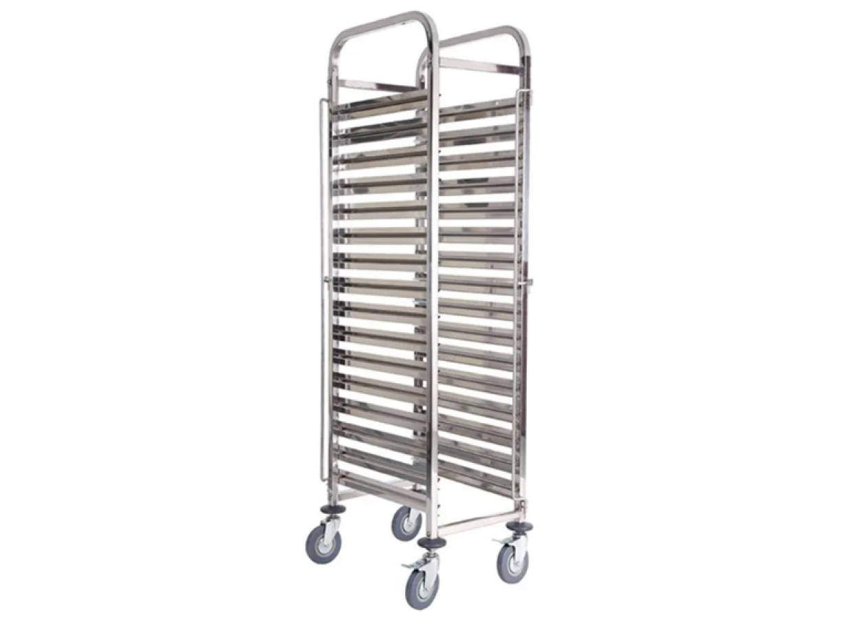 Carrinho armário esqueleto inox para 18 níveis cubas GN 1/1 com rodízios;